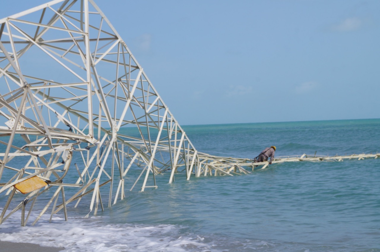 Las fuertes corrientes que se dejaron sentir este viernes, provocaron que se deslavara la base de una de las torres de conducción de energía eléctrica de alta tensión, la cual se desplomó sobre el mar.