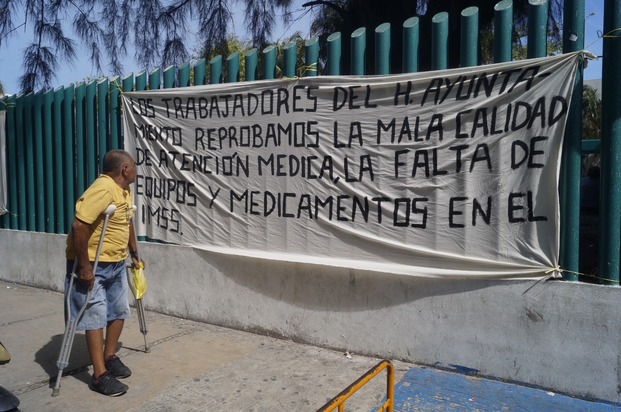Afiliados al Sindicato Único de Trabajadores de Base del Ayuntamiento y Juntas Municipales del Carmen (Sutbajc) marcharon y se manifestaron a las puertas de la Unidad Médico Familiar número 4 del Instituto Mexicano del Seguro Social (IMSS), en protesta por la falta de medicamentos, médico especialista, pésima atención y retrasos en el pago de viáticos para traslados.