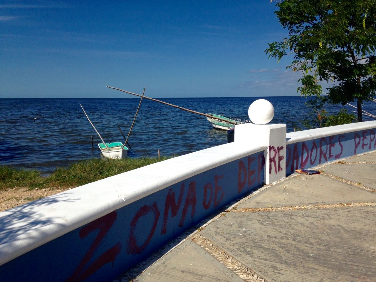 La pinta aparentemente realizada con una brocha gruesa y pintura roja consigna "Zona de depredadores pepino de mar pulpo tortuga y droga ect".