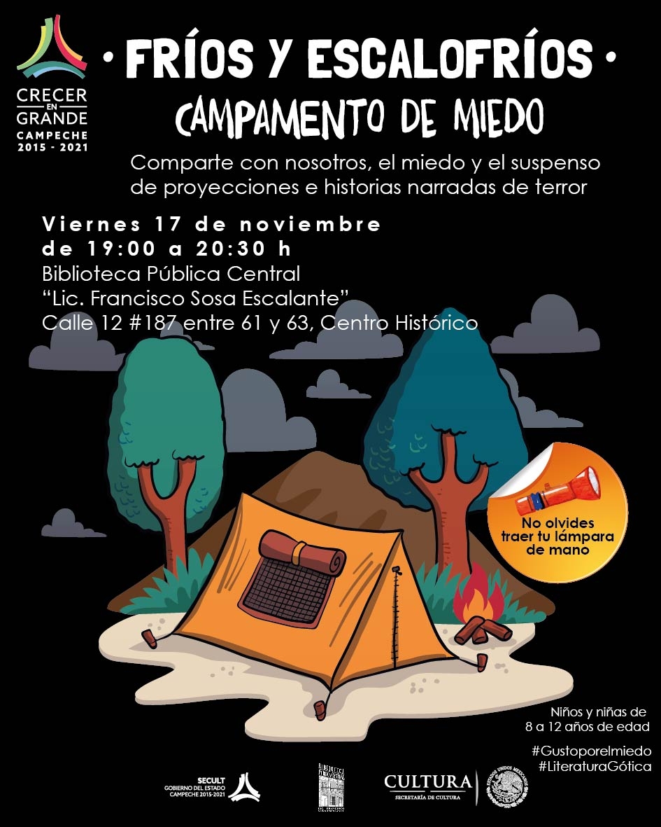La Secretaría de Cultura del Gobierno del Estado (Secult) lanzó una invitación a niños y niñas de 8 a 12 años de edad al Campamento de Miedo [i]Fríos y escalofríos[/i], que se llevará a cabo el viernes 17 de noviembre, en la Biblioteca Pública Central “Francisco Sosa Escalante”, a partir de las 19 horas, con el fin de acercar, promover y cultivar la lectura en las nuevas generaciones.
