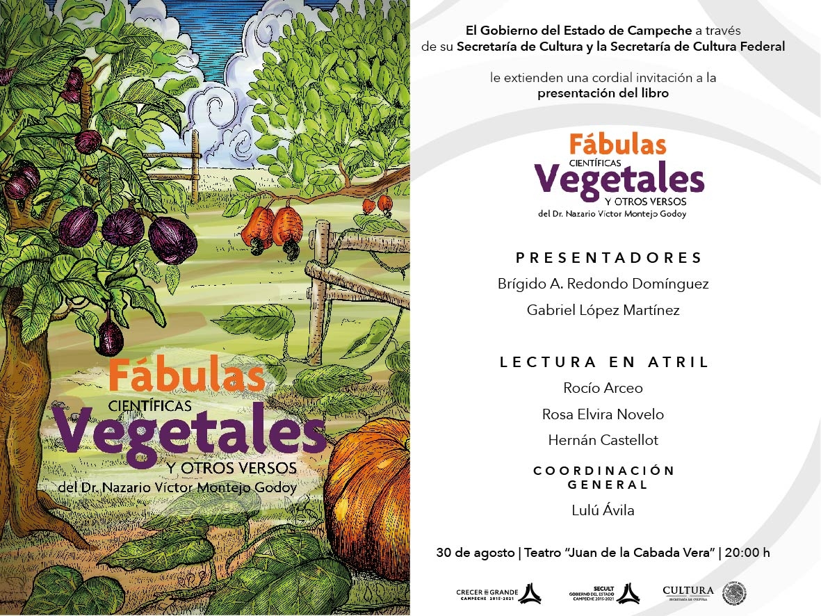 La Secretaría de Cultura (Secult) de Campeche realizará este miércoles 30 de agosto la presentación del libro [i]Fábulas Científicas Vegetales y otros versos[/i], de Nazario Víctor Montejo Godoy, en el Teatro “Juan de la Cabada Vera” en punto de las 20 horas.