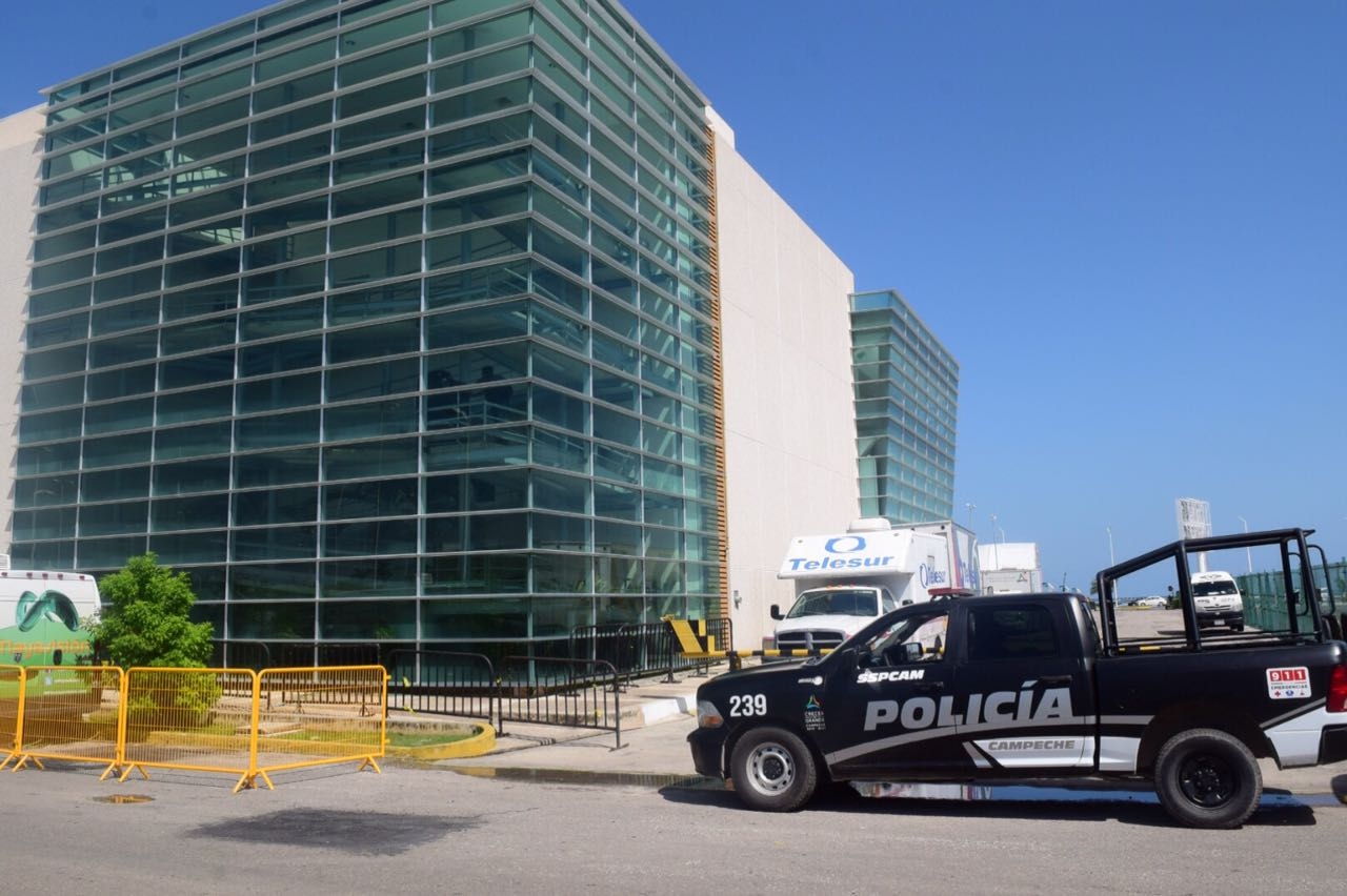 Vallas, patrullas, policías y camiones de televisoras locales y nacionales rodean el Centro de Convenciones Campeche XXI donde el día de mañana se realizará el segundo informe de gobierno de Alejandro Moreno Cárdenas.