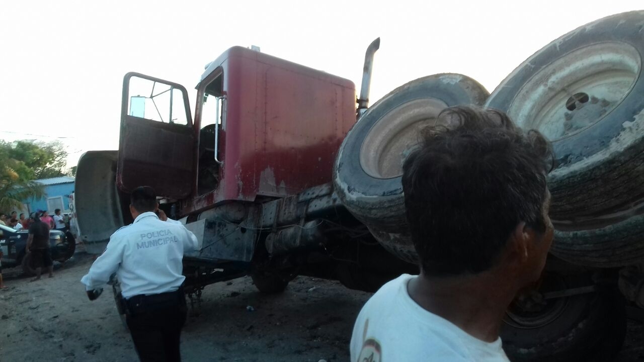 De acuerdo con testigos presenciales, la pesada unidad transitaba a baja velocidad por la calle, cuando de repente el suelo de hundió, provocando que el volteo se ladeara y por el peso, terminara sobre su costado derecho, cayendo sobre una endeble casa de cartón.