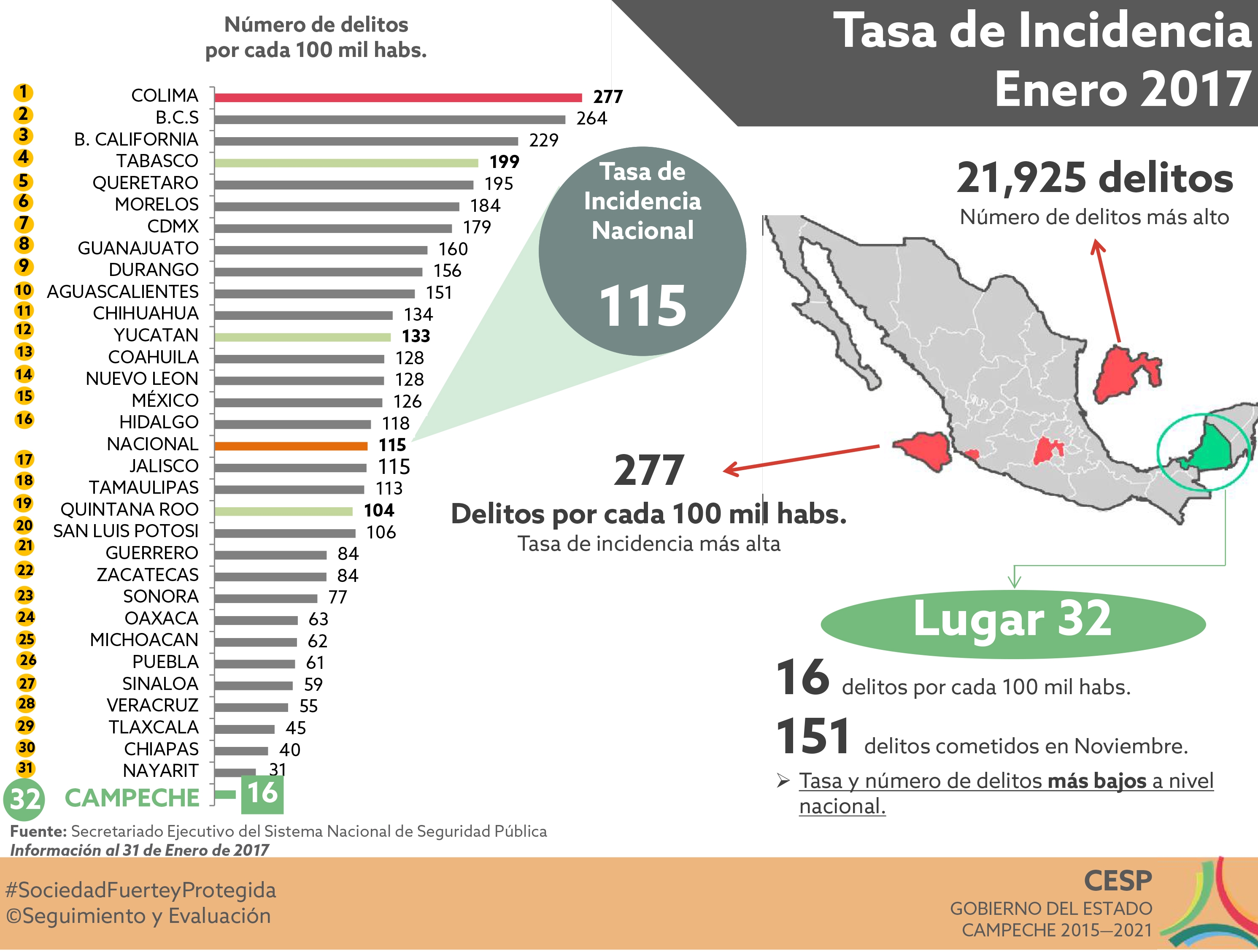 En el reporte oficial de este mes, Campeche aparece en el último sitio con el menor porcentaje de todo el país en la tabla de comparación entre las entidades federativas sobre la tasa de incidencia delictiva, al registrar 16 hechos cometidos por cada 100 mil habitantes, cifra inclusive muy inferior a la media nacional que es de 115.