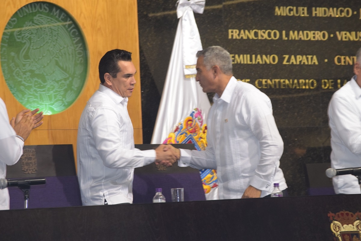 Campeche es un nuevo actor de la política nacional. Es uno de los nuevos grandes temas vinculados al desarrollo del país que fortalece la política nacional, la económica y la social, expresó el gobernador Alejandro Moreno Cárdenas durante la sesión solemne del Congreso con motivo de la develación de la leyenda “Centenario de la Constitución Política de los Estados Unidos Mexicanos”, en letras doradas, en el muro de honor de la sede legislativa.