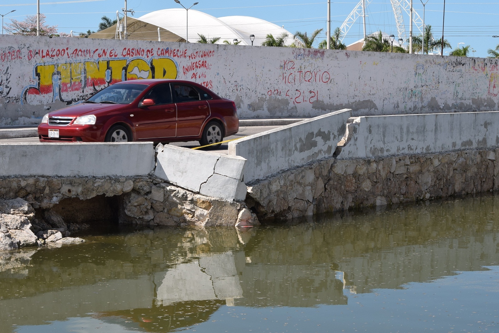 Una porción del muro de contención de la ría de San Francisco se desprendió como resultado, según los vecinos, del drenaje del Casino de Campeche, que desemboca precisamente en ese cuerpo de agua.