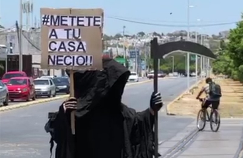 Enrique Urrutia, un campechano que mostró tener creatividad, salió por diversas calles y avenidas de la capital caracterizado de la muerte, portando un letrero que decía #Métete a tu casa, necio; causó revuelo y fue tendencia en las redes sociales en la entidad debido a que de manera cruda lanzó un mensaje claro para que los ciudadanos comiencen a tomar conciencia, pues dice que todos están bajando los brazos.