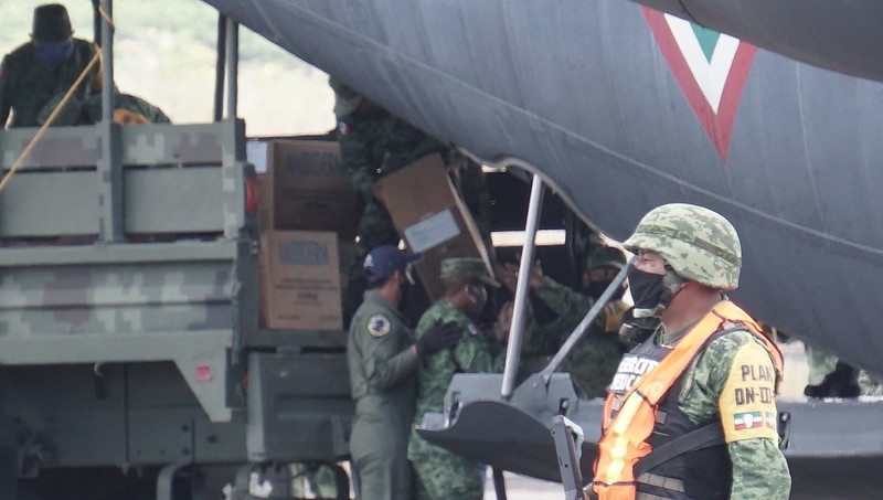 El comunicado oficial entregado por uno de los elementos, señala que "la Fuerza Aérea Mexicana trasladó al aeropuerto Internacional de esta ciudad y procedentes de la Ciudad de México, 7 toneladas de equipos e insumos médicos para atención de la unidad operativa de Hospitalización reconvertida en las instalaciones del 10º Batallón de Infantería, en el marco del plan DN-III-E".