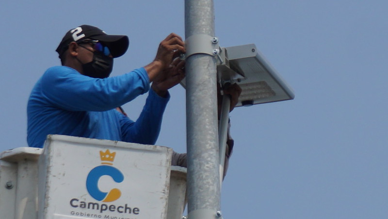 Personal de la Subdirección de Alumbrado Público del Ayuntamiento de Campeche respondió a los compromisos pactados con los vecinos del área y colocó cinco luminarias LED que se abastecen con celdas solares para iluminar los pasos peatonales de la carretera del Golfo, también conocida como avenida Costera.