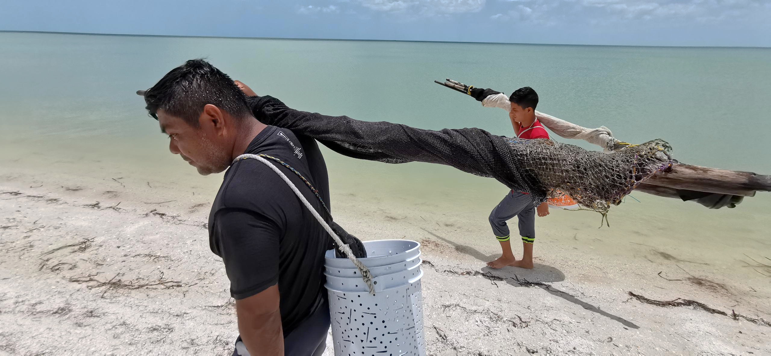 Tras dedicarse 12 años a la captura de camarón pariseño, Antonio ahora es acompañado por su hijo Bryan de 14, quien tiene cuatro ayudando a su padre con el oficio de pescador, pero a su vez también está dedicado al estudio. Ambos caminaban hacia la orilla con su “saca”, una herramienta fabricada de manera rudimentaria, que ayuda a sacar el camarón pariseño de las zonas más cercanas a la playa de Champotón.