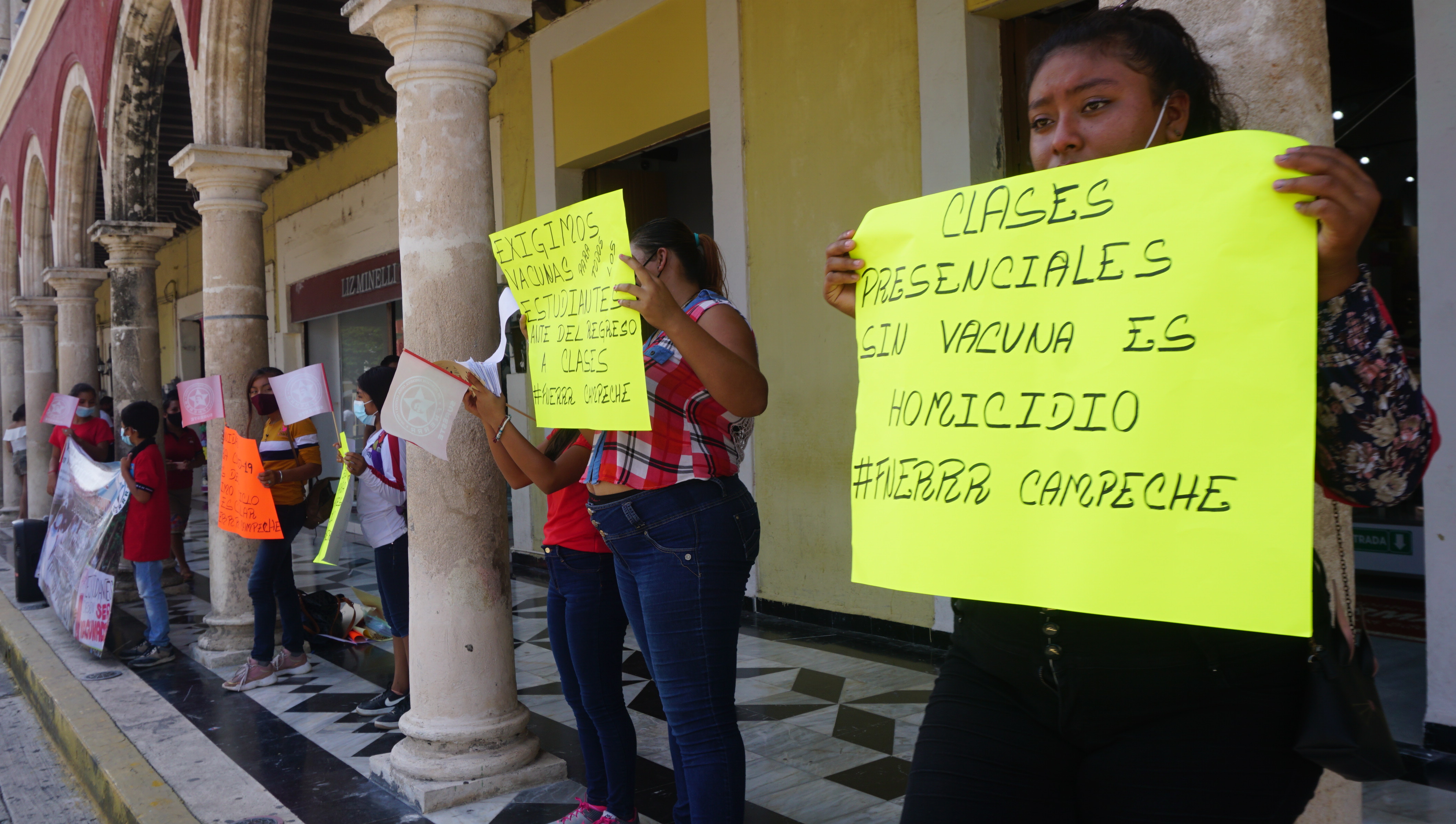 Una veintena de jóvenes integrantes del Frente Nacional de Estudiantes Revolucionarios Rafael Ramírez (FNRRR) realizaron una cadena humana y manifestaron sus exigencias en el Centro Histórico de la ciudad de Campeche; su petición es recibir vacunas anti Covid-19 antes de regresar a clases presenciales.