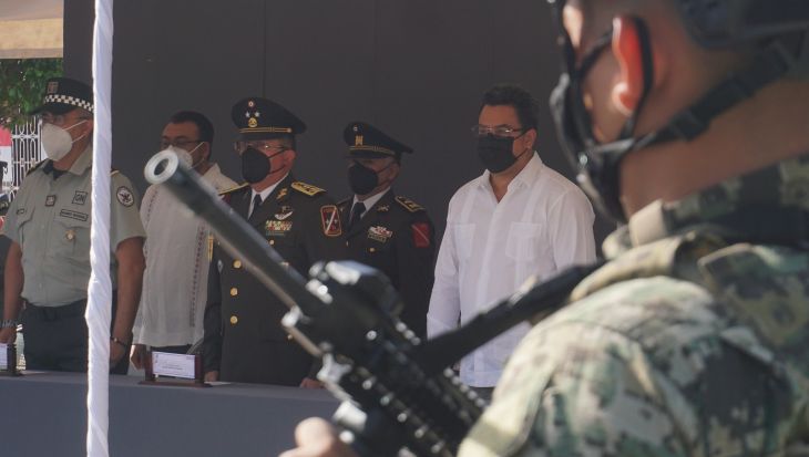 El funcionario encabezó la ceremonia junto a los comandantes de la 33a Zona Militar, Hernán Cortés Hernández, y de la Tercera Región Naval, Héctor Capetillo López En este acto realizado en el que parque del Barrio de Santa Ana montaron guardia de honor y depositaron ofrenda floral en honor de quienes entregaron su vida por la patria, sin dejar a un lado el espectacular acto de tiros al aire con los más de 20 elementos armados con rifles de asalto que sólo usaron cartuchos percutidos.