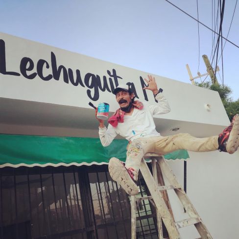 Incluso para contactarlo fue una anécdota más, pese a que lo buscan marcas locales para que sea la imagen de sus productos, él sigue realizando sus trabajos de muralista y rotulista, al solicitarle una charla dijo que: “Venme a ver a donde estoy chambiando, tengo jale de rótulos de aquí hasta enero”, por lo que el escenario fue un local de helados naturistas donde está recreando una fachada natural.