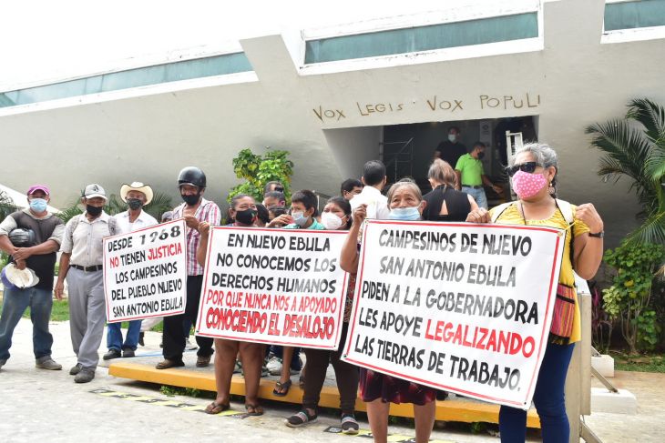Unos 40 pobladores de San Antonio Ebulá arribaron este jueves a los bajos del Palacio de sesiones legislativas del Congreso del estado de Campeche para exigir a diputados soluciones agrarias a sus tierras, pues desde hace más de 50 años han luchado contra uno de los terratenientes, Daniel Escalante Escalante, quien los obligó a moverse de unas tierras que presuntamente no le pertenecían.