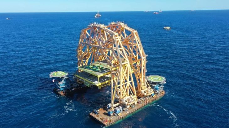 Relató que hace algunos días esta estructura que pesa 8 mil toneladas y mide 88.39 metros de longitud total, que consta de doble pórtico para cargas pesadas y de dos estructuras espaciales de celosía encima de dos barcazas, el cual tiene 50 metros de distancia entre cada barcaza, fue trasladada a la Sonda de Campeche, en el Activo Integral Ku-Maloob-Zaap, para iniciar maniobras de instalación de plataformas, dentro del Plan Nacional de Producción de Hidrocarburos del gobierno federal.