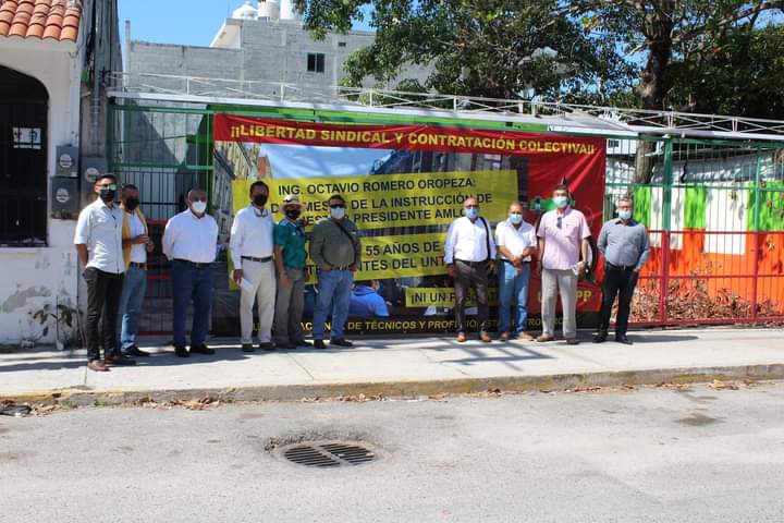 Integrantes de la Unión Nacional de Técnicos y Profesionistas Petroleros (UNTyPP), se manifestaron frente a las oficinas de Petróleos Mexicanos (Pemex), para solicitar al director general, Octavio Romero Oropeza, cumpla con la instrucción del presidente de México, Andrés Manuel López Obrador, de regresarlos al régimen de los 55 años de edad para jubilarse, similar a lo que sucede con los socios del Sindicato de Trabajadores Petroleros de la República Mexicana (STPRM).