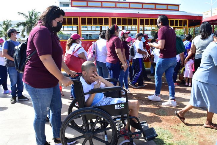 Este miércoles, y con motivo reciente del día del niño, la Secretaría de Bienestar que dirige Patricia León López, en conjunto con el Patronato de la Ciudad y el Instituto de Cultura y Artes, en conjunto con la administración del Centro de Atención Múltiple (CAM) 5 de la capital, recibieron a niños del CAM 9 de Champotón, los pequeños de ambas instituciones, que sufren de alguna discapacidad motriz, sonora, neuronal e intelectual, pasearon con en los tranvías de la ciudad y los llevaron a conocer museos.