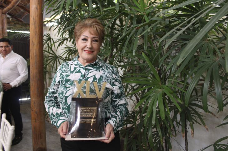 Como forjadora de nuevas generaciones de abogados y por sus 45 años de servicios, el Colegio de Notarios Públicos de Campeche hizo entrega de un reconocimiento a la licenciada Estela Rene Vaught Mosqueda, titular de la Notaría Pública número 7 con sede en Ciudad del Carmen.
