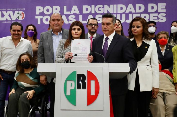 En la sede nacional del PRI, Alejandro Moreno acudió al salón Alfonso Reyes en compañía de las diputadas de su partido y del coordinador de la bancada tricolor en San Lázaro Rubén Moreira, y el senador guerrerense Manuel Añorve Baños.