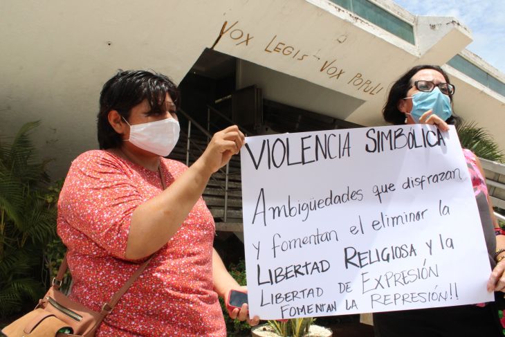Tras la aprobación de mayoría en el Congreso de Campeche por parte de la bancada de Movimiento Regeneración Nacional (Morena), sobre la Ley de Violencia Simbólica, grupos católicos arribaron a la explanada Justo Sierra Méndez en las oficinas del Congreso del Estado de Campeche, y se manifestaron en contra de la aprobación de los diputados locales sin antes tomar en cuenta las observaciones de los grupos religiosos.