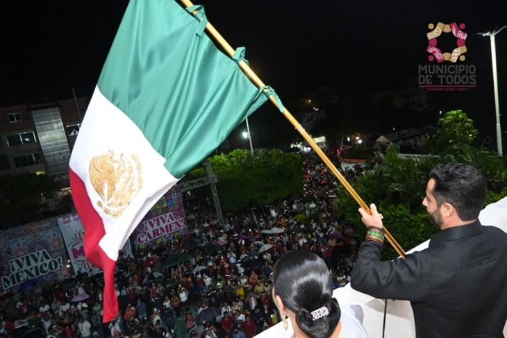 Pese a la llovizna que se dejó sentir la noche de este 15 de septiembre, cientos de carmelitas acudieron a la conmemoración del tradicional Grito de Dolores, en la Plaza Cívica 7 de Agosto, que encabezó el alcalde Pablo Gutiérrez Lazarus.