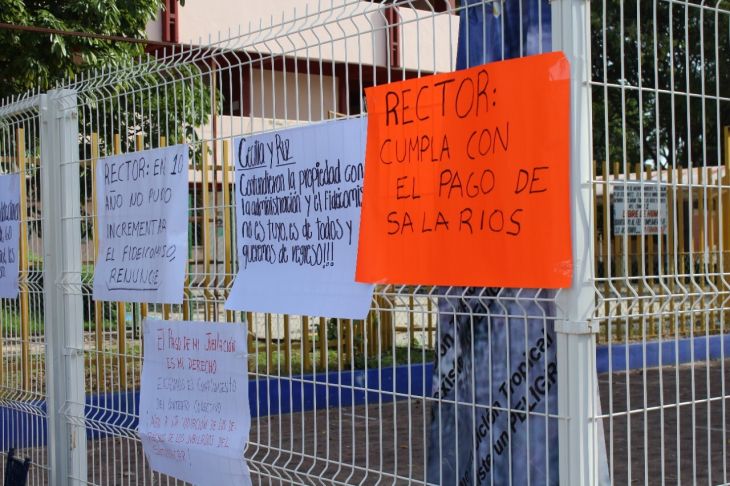 Cerca de la 6 horas, un grupo de aproximadamente 70 jubilados universitarios se presentó en las instalaciones de Campus II de la Unacar, que alberga a la Escuela Preparatoria Diurna, para colocar carteles de protesta por el incumplimiento en el pago de sus remuneraciones, además de cadenas y candados para impedir el acceso del personal y de los alumnos.