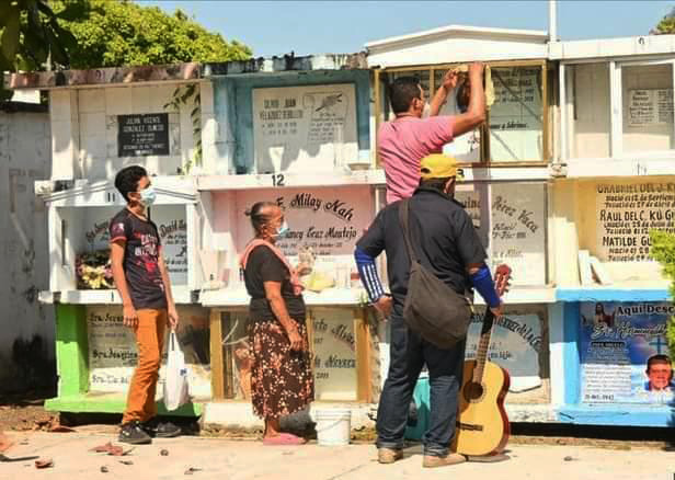 Desde muy temprano, familias completas acudieron a los cementerios de Carmen para limpiar las criptas de sus difuntos, así como depositar sus ofrendas de flores, incienso, veladoras, entre otros.