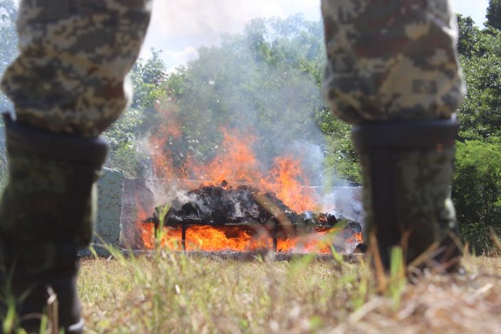 Posteriormente, en las instalaciones del Décimo Batallón de Infantería de la XXXIII Zona Militar, se llevó a cabo la incineración de 73 kilos 596 gramos de marihuana, 15 gramos de cocaína, 339 gramos de metanfetamina, 530 kilos 946 gramos de clorhidrato de cocaína, 64 gramos de clorhidrato de metanfetamina y 10 gramos de clobenzorex.