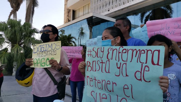 Bajo la promesa de pagarles finalizando el contrato por tres meses firmado los primeros días de enero, trabajadores de la salud como enfermeros y asistentes médicos se manifestaron, marcharon y plantaron en los bajos del Palacio de Gobierno pues Insabi los tiene trabajando ya por 45 días sin pagarles, afectando a sus familias. Según los afectados, esto es recurrente a pesar que el presidente de la república, Andrés Manuel López Obrador, prometió mejoras al sector salud.