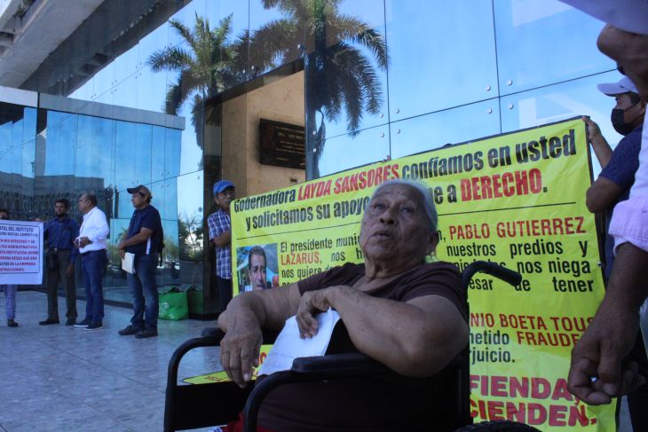 Fueron dos protestas las que llegaron al Palacio de Gobierno, la primera por despojo de tierras autorizada por el Ayuntamiento de Carmen mediante una escritura pública considerada apócrifa, pues la afectada Candelaria Casanova Cabañas, acusó que no sabe leer y la hicieron firmar un documento sin tener a alguien de confianza para explicarle lo que estaba haciendo.