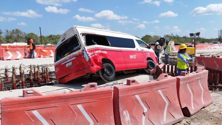Debido a los trabajos del Tren Maya en la carretera Campeche-Mérida a la altura del kilómetro 100+300 que alenta el tráfico vehicular, un trailero no se percató de los señalamientos y de las advertencias de los trabajadores de Carso y embistió por alcance a una combi de transporte colectivo y resultaron ocho personas heridas, además que la unidad de transporte terminó en una zanja donde irán trabes para un paso a desnivel.