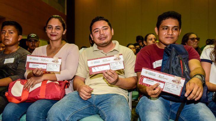 En el evento, dio a conocer que entregaron 590 tarjetas del Banco del Bienestar para que los beneficiarios puedan cobrar los 6 mil 310 pesos que reciben durante los 12 meses que dura su capacitación.