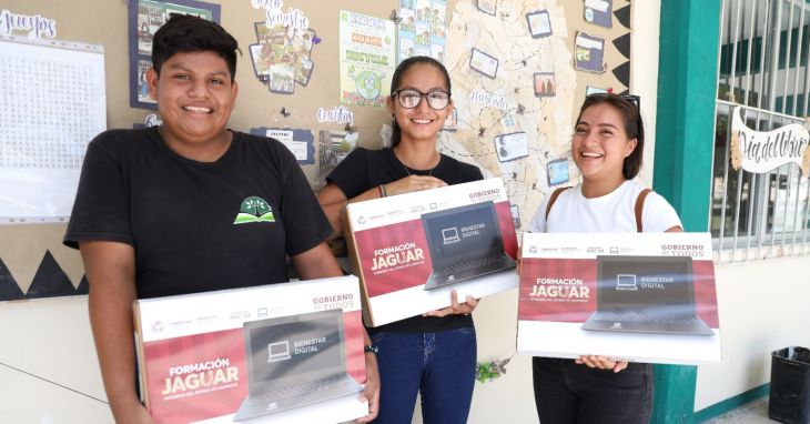 Un total de 56 equipos de cómputo del programa Formación Jaguar -en su proyecto Bienestar Digital- fueron entregados a estudiantes de seis instituciones educativas de nivel Medio Superior y Superior, así como remesas de uniformes escolares para niñas y niños de escuelas primarias públicas del municipio de Candelaria, Campeche