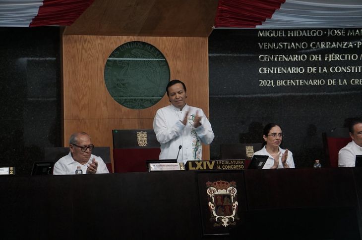 Entró en medio de vitoreos por parte de simpatizantes morenistas de Carmen que llegaron al salón de sesiones legislativas, y tras proyectar un video con los avances de la LXIV Legislatura del Estado de Campeche, el presidente del Congreso del Estado, Alejandro Gómez Cazarín, se levantó de su silla y frente a simpatizantes de su partido, abrazó a los coordinadores parlamentarios del Partido Revolucionario Instucional (PRI), Ricardo Medina Farfán, y de Movimiento Ciudadano (MC) Paul Arce Ontiveros, para luego mandar un mensaje de paz a los grupos políticos, pues en algún momento coinciden en ideología a favor de los campechanos.