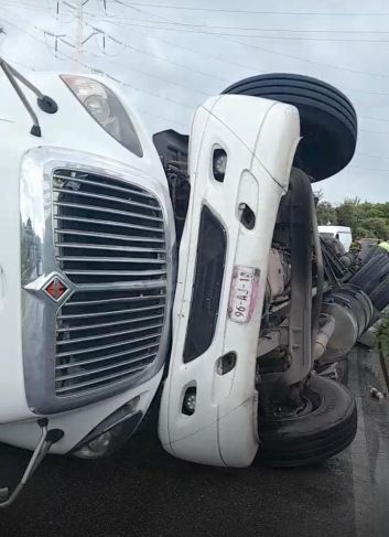 El accidente se registró cerca de las 8:10 horas de este lunes, cuando un tracto camión de color blanco, con placas de circulación 96-1J-IA, del servicio federal de carga, transitaba por el Puente de la Unidad, a exceso de velocidad, pero al salir del viaducto, en la curva previa a la caseta de cobro, el conductor perdió el control, volcándose sobre su costado derecho.