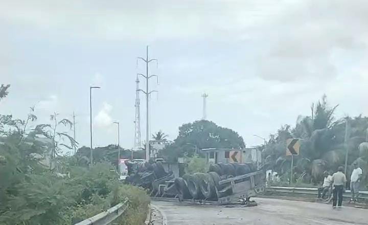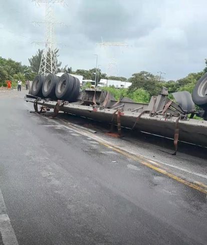 La unidad, que transportaba diez tubos de acero, es propiedad de la empresa Logística Omar Gamiñó, S.A. de C.V., misma que quedó con las llantas para arriba, en tanto que su pesada carga rodó a un costado de la cinta de rodamiento, sobre el área en donde se lleva a cabo la introducción de la tubería que se adosará al Puente de la Unidad, del acueducto Chicbul-Carmen.