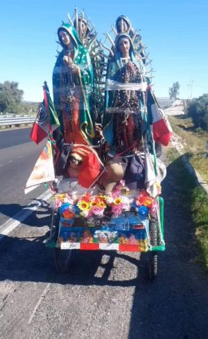 Su recorrido inició el 15 de mayo, cuando cargó en su espalda una imagen de la guadalupana de 1.5 metros y montó su bicicleta, a la que adaptó un remolque con otras figuras con un peso aproximado de 130 kilogramos e inició su recorrido.