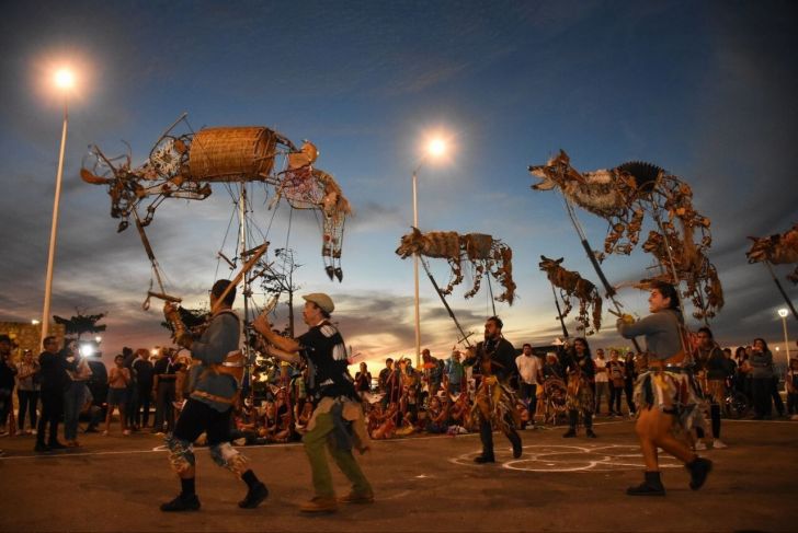 Bajo la dirección de Iker Vicente y Jaqueline Serafín, el montaje también se presentó desde el parque San Martín y desfiló con sus grandes marionetas elaboradas con materiales naturales, hasta el parque principal.