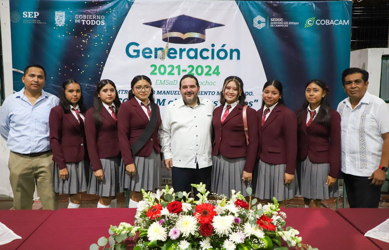 Este lunes por la tarde, el director general del Cobacam, Ánuar Dáger Granja, encabezó el inicio de las ceremonias de graduación en el EMSaD 06 de Sihochac, un evento que se llevó a cabo en la cancha techada de la localidad y contó con la presencia de autoridades educativas y municipales, donde se entregó los documentos que acreditan la culminación de sus estudios de educación Media Superior a un total de 35 alumnos.