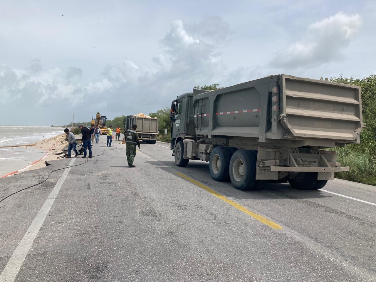 La carretera federal 180, en el tramo Ciudad del Carmen-Champotón, se vio afectada con el ingreso de agua de mar que dejó en la cinta asfáltica arena, basura y piedras.