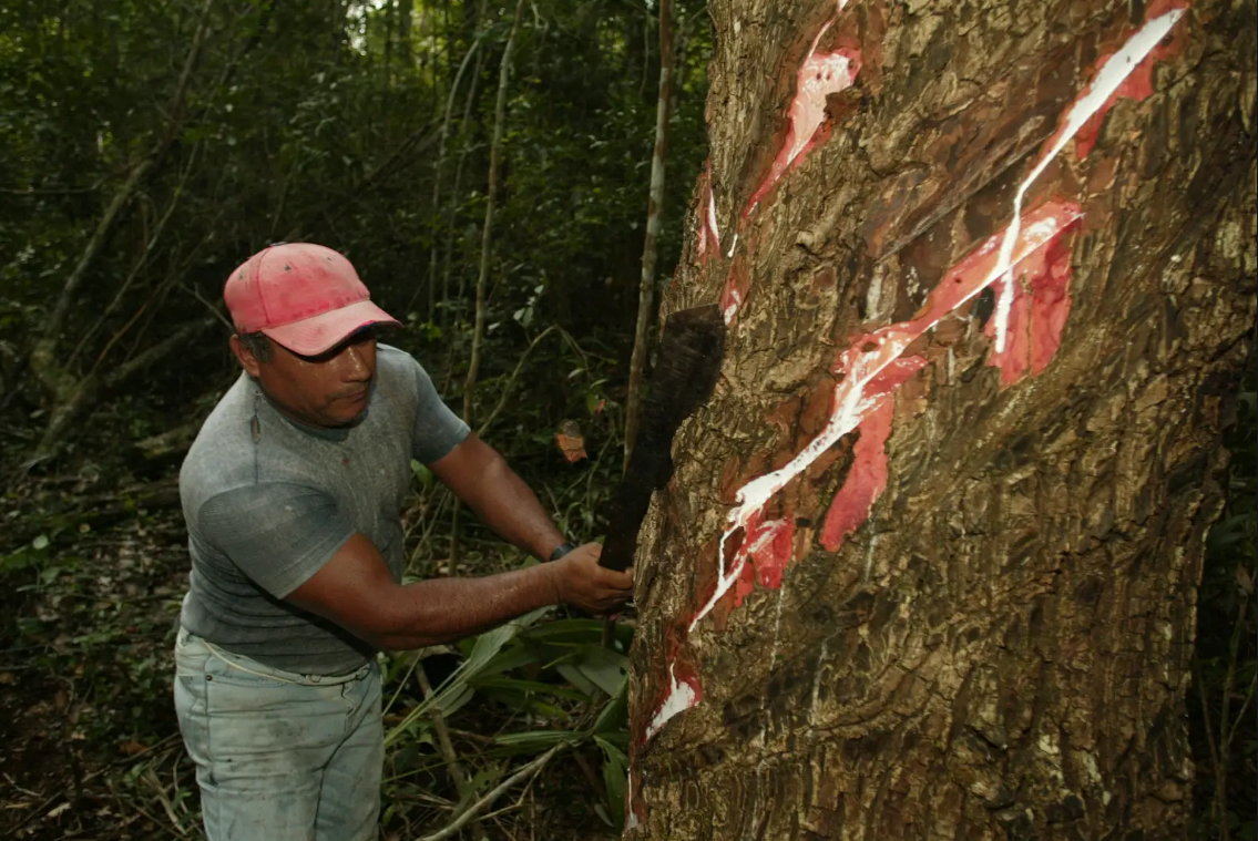 Este último, más que un predio infestado de árboles de Chicozapote, se trata de un espacio con algunos ejemplares de dicho árbol, donde realizan una demostración de la extracción de la resina, mientras otro integrante de la familia entrega muestras de la resina ya endurecida para que se mastique durante el camino y el senderista genere la saliva suficiente para hidratarse.