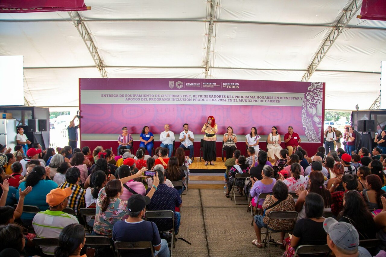 Acompañada de la presidenta del Sistema Estatal DIF, Laura Sansores San Román; de la titular de la Secretaría del Biemestar, Eliza Hernández Romero, y del alcalde, Pablo Gutiérrez Lazarus, entregaron apoyos del programa de Cisternas FISE, Refrigeradores de Hogares del Bienestar y apoyos del Programa de Inclusión Productiva.