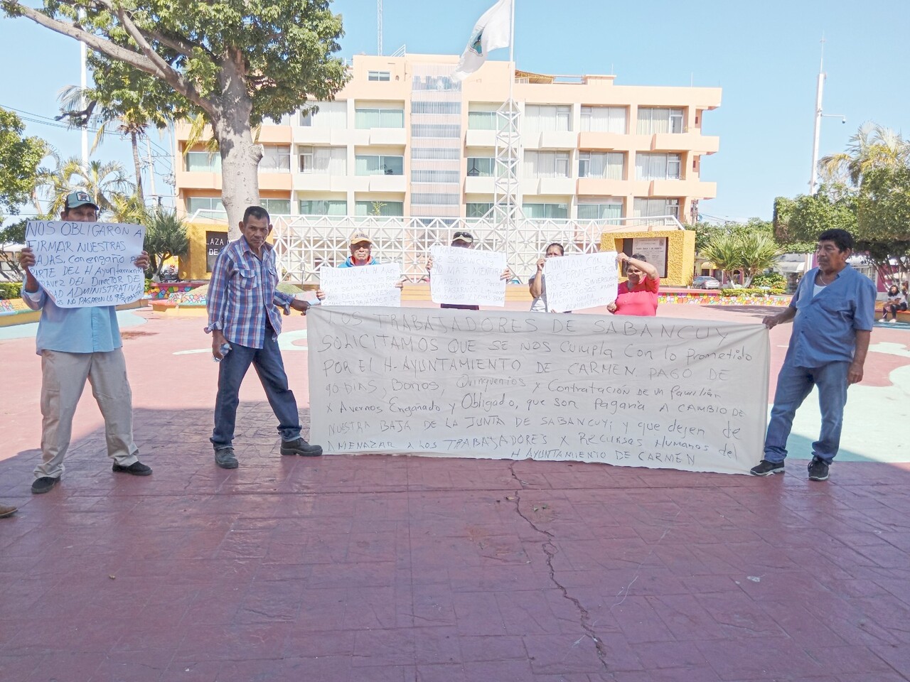 Cerca de las 10 horas arribaron a la explanada 7 de agosto, frente al Palacio Municipal, un grupo de aproximadamente 10 ex trabajadores de la Junta Municipal de Sabancuy, entre ellos Antonio Bello Abreu, Jorge Luis Santos, Celia del Carmen Pérez López, Javier Ek.