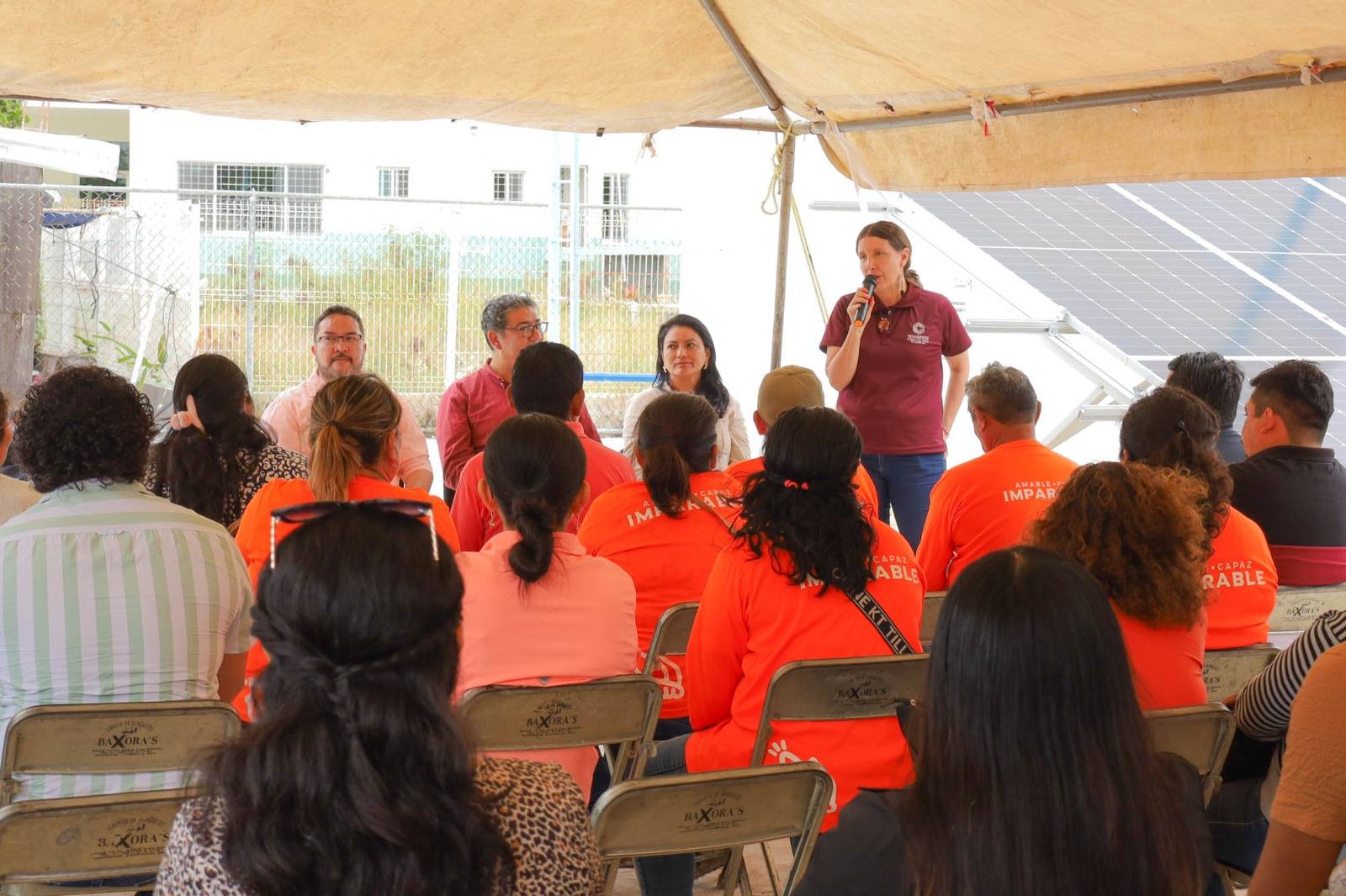 En Isla Arena, municipio de Calkiní, la titular de la Secretaría de Medio Ambiente, Biodiversidad, Cambio Climático y Energía, Jocelyn Durán Murrieta, autoridades municipales y locales, realizan la inauguración del proyecto de equipamiento con paneles solares que suministran de energía al sistema de bombeo de agua potable de la comunidad.