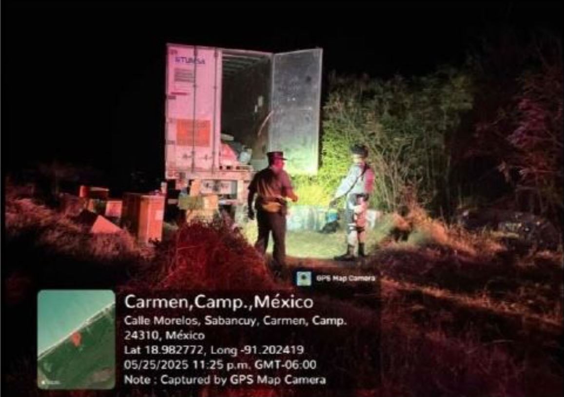 Se reporta que el conductor del tractocamión fue abordado por cinco sujetos que viajaban en un automóvil compacto. El reporte fue atendido de inmediato y se localizó la unidad en una brecha en el tramo Champotón-Carmen, al igual que el vehículo en que viajaban los asaltantes, quienes huyeron del lugar.