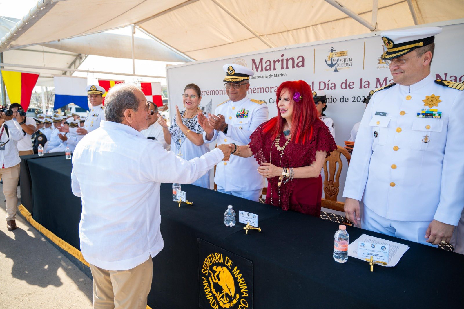 En un acto solemne celebrado en las instalaciones de la Administración Portuaria Integral (API) de Lerma, la gobernadora Layda Sansores San Román, acompañada del comandante de la Séptima Zona Naval, vicealmirante Alfredo Ramón Enríquez Delgado, presidió la Ceremonia Conmemorativa al “Día de la Marina Nacional”, con el propósito de rendir homenaje a la entrega, valentía y compromiso de quienes integran esta noble institución.