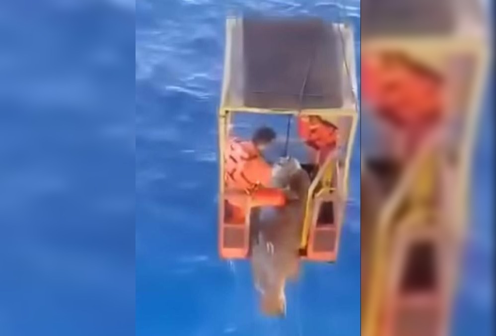 Difundido en redes sociales a través de un video, se puede apreciar el descenso de una canastilla de seguridad, utilizando una grúa, ocupada por dos trabajadores petroleros.