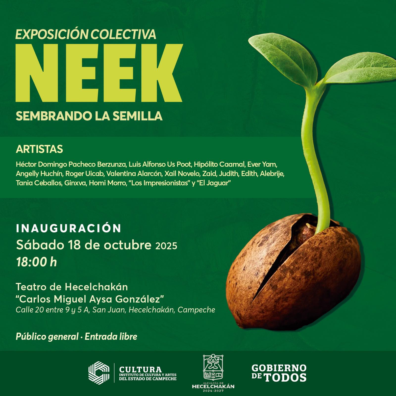 La exposición colectiva Neek, sembrando la semilla abrirá sus puertas este sábado 18 de octubre a las 18 horas en el Teatro de Hecelchakán Carlos Miguel Aysa González, ubicado en la calle 20 entre 9 y 5 San Juan.