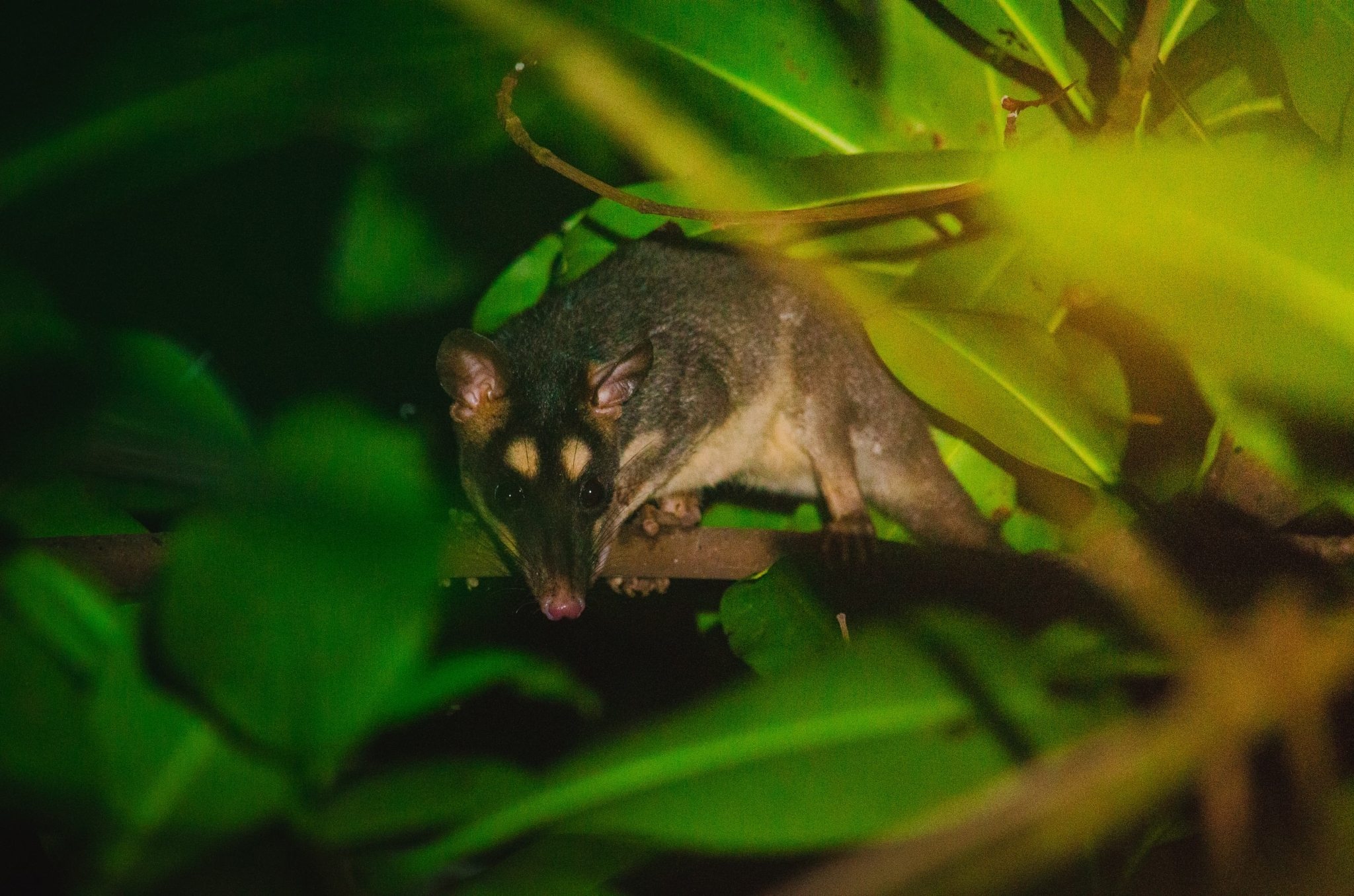 Es una especie nocturna, terrestres y con hábitos de oportunistas, son solitarios, capaces de nadar y de escalar, se trata de la zarigüeya cuatro ojos.