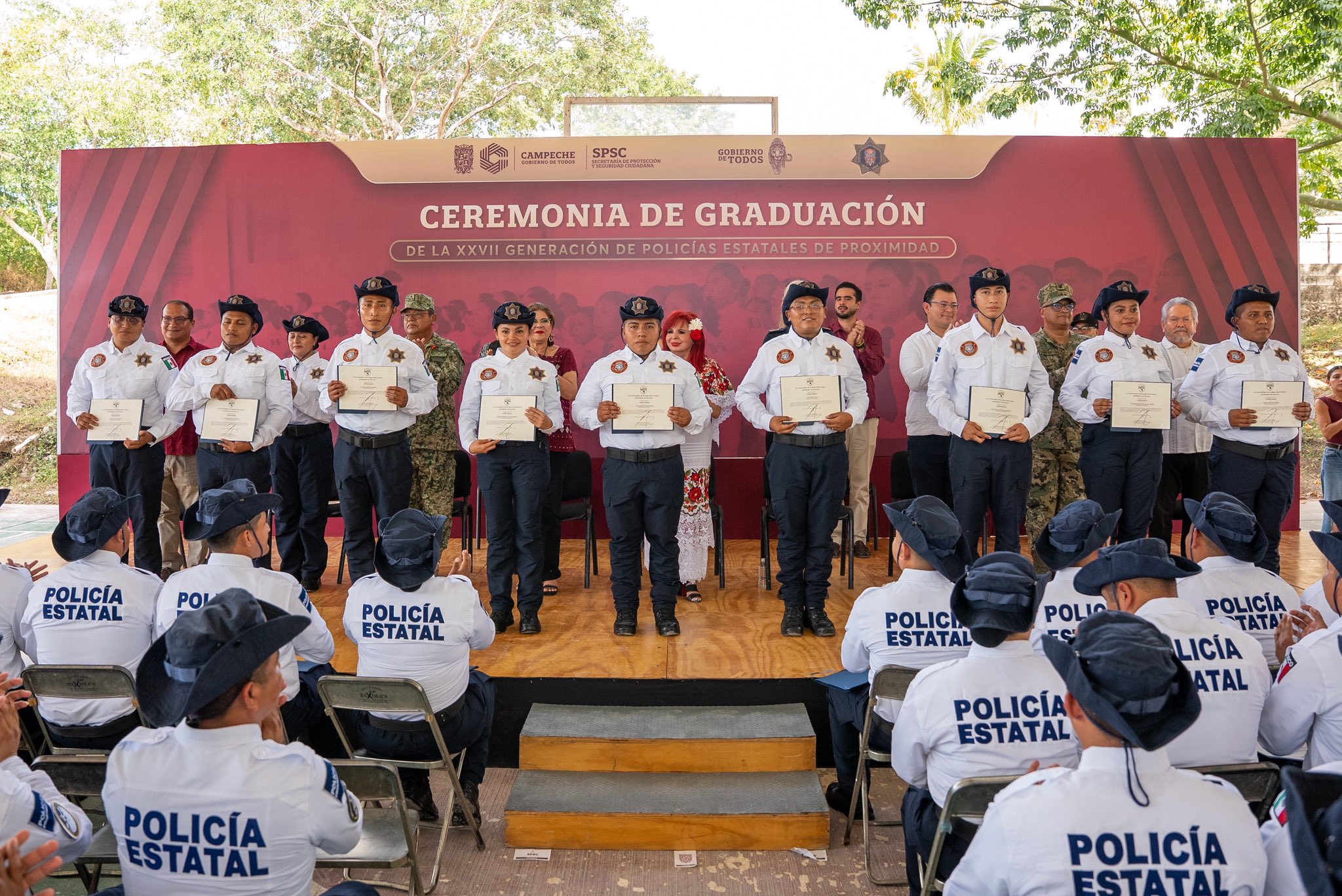 La gobernadora Layda Sansores San Román presidió la ceremonia de graduación de la XXVII Generación de Policías Estatales de Proximidad, integrada por 75 nuevos elementos, resultado del programa de profesionalización que fortaleció la formación inicial de la corporación para consolidar un modelo policial más cercano, humano y eficiente al servicio de Campeche.